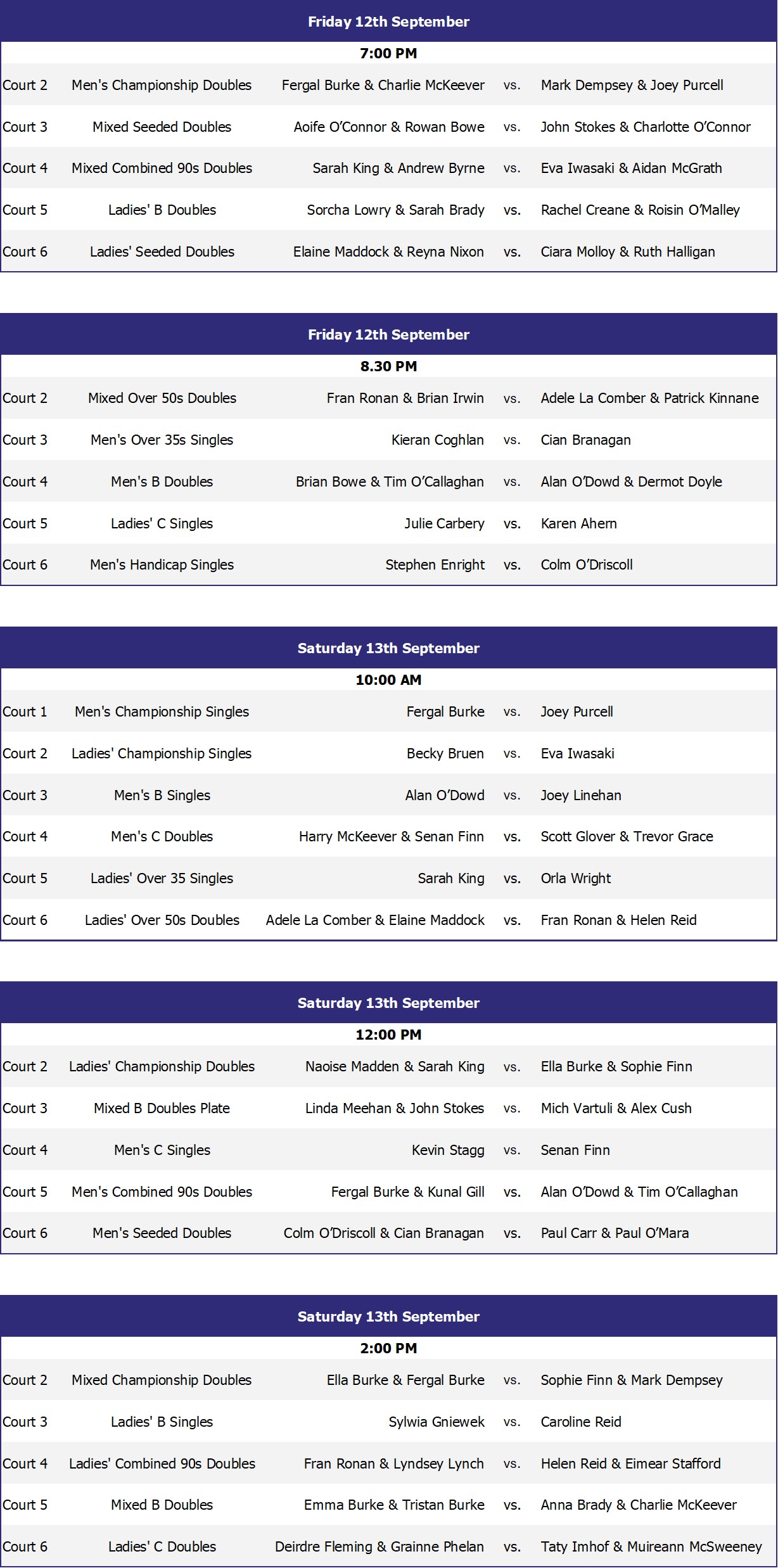 The full match schedule for Friday 12th and Saturday 13th September is now available.