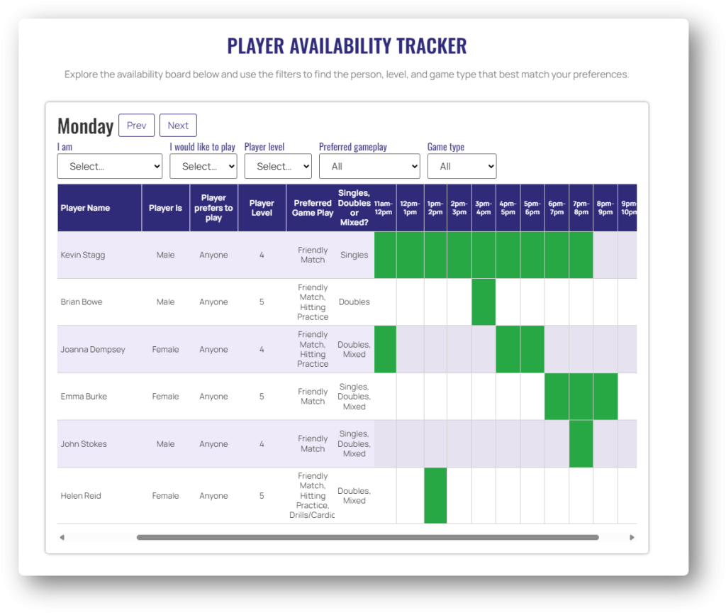 With Tennis-Match, members can publish their regular availability and a short player profile—including who they are, who they’re looking to play, preferred format (singles, doubles, or mixed), playing level, and match type (friendly, hitting session, or cardio/drills). Once submitted, your details appear instantly on the availability board.